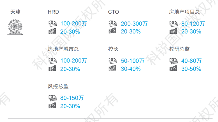 天津整体薪资呈现上涨的趋势,尤其金融、教育、高科技等行业,核心岗位如在线教育的教学教研岗、AI算法、底层开发架构等岗位跳槽涨幅可达30-50%。本数据来源于猎头公司九州ku游官网国际资深行业专家对2021年热门职位薪酬范围及跳槽涨幅的预测,供HR和猎头招聘参考。