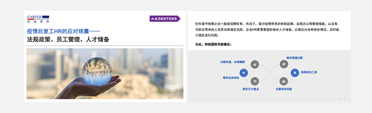 为了帮助众多企业人力资源工作者应对挑战,九州ku游官网国际联合国内知名律所“大成律师事务所”,推出疫情后《复工HR的应对锦囊》手册,从法律政策、员工管理、人选储备几个方面对企业HR有序召开复工后的各项人力资源管理给予帮助。